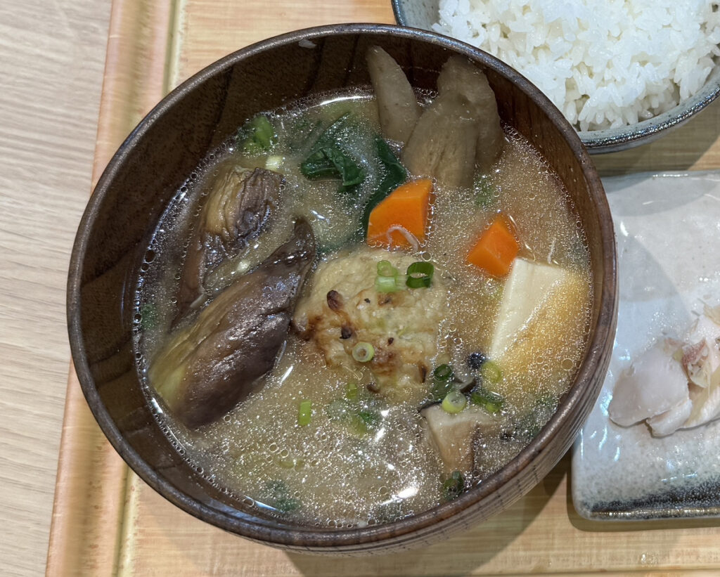 野菜たっぷりのお味噌汁の旨味をさらに引き出す、大きめサイズの鶏だんご、orマグロ団子がお選びいただけます。全て鶏だんごとマグロ団子は、どちらも心を込めて店舗で手作りしております。食べ応えがあり、ふわっと柔らかな食感が自慢です。