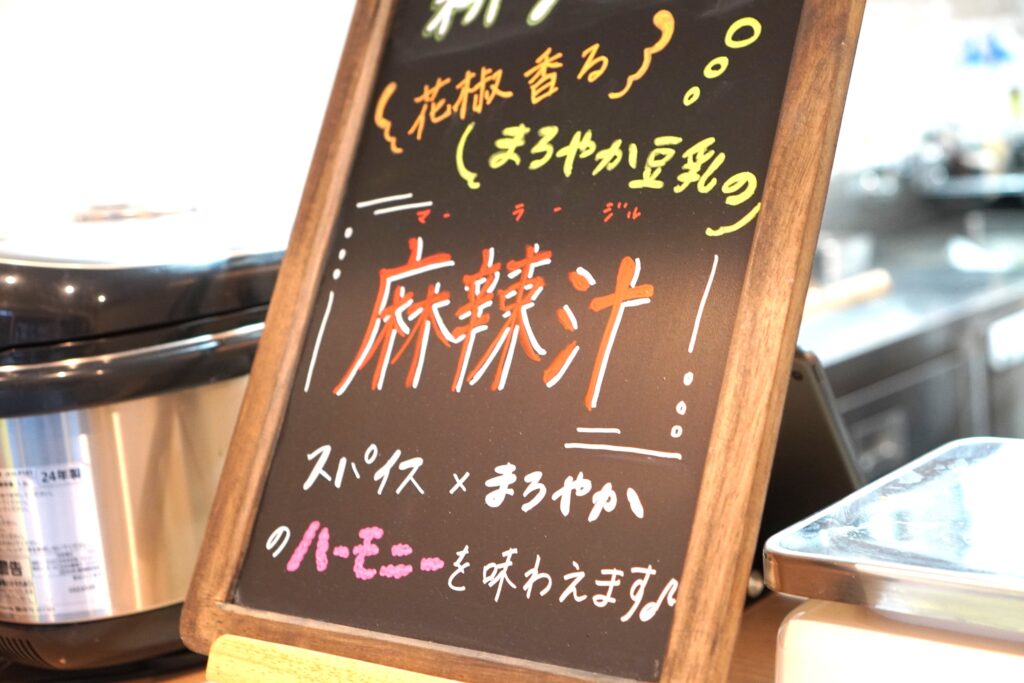 注文ごとに、1つ1つ温めて、豆乳、味噌、スパイスを加えます。花椒の香りがふわっと香ります。