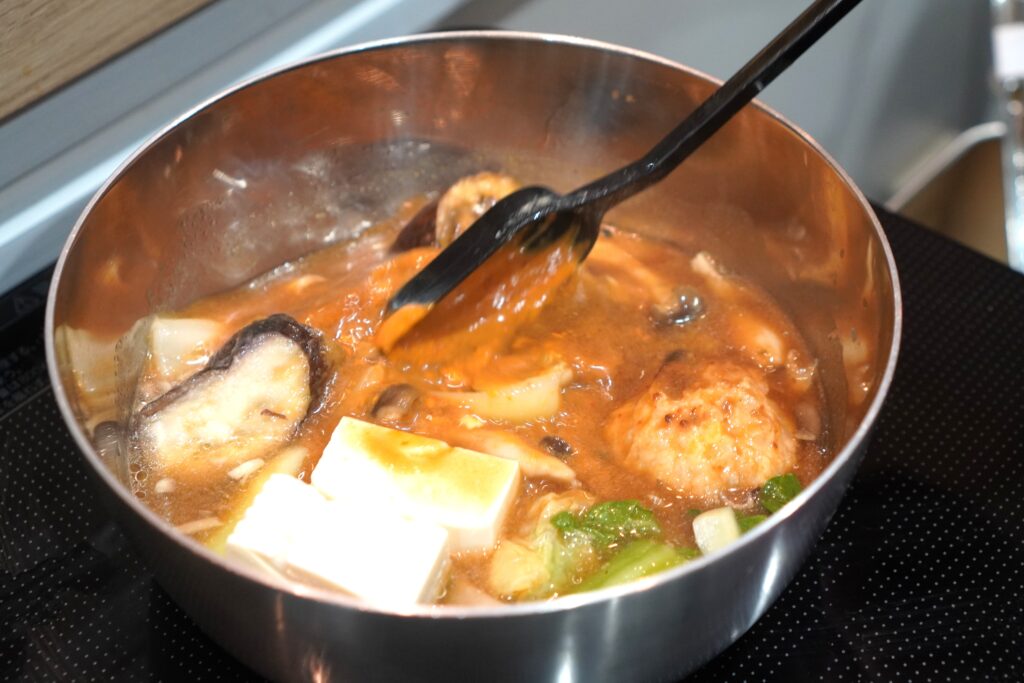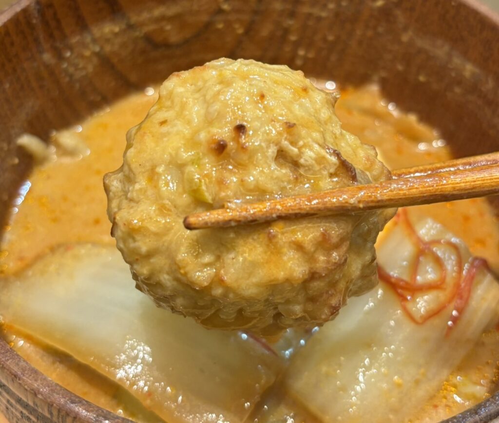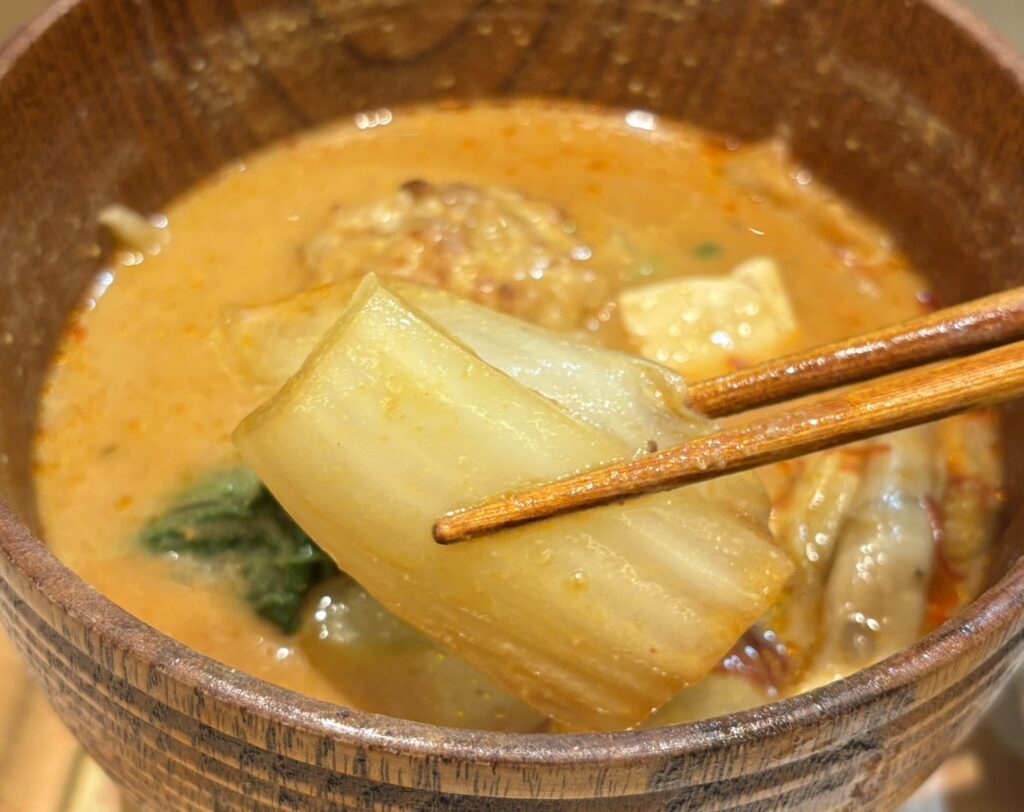具材は、白菜、青梗菜など葉野菜を中心に、肉団子、茄子、きのこなどゴロゴロ入っています。