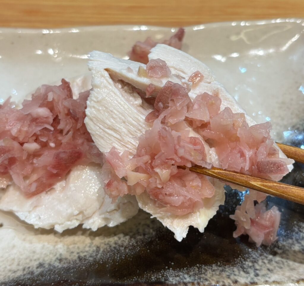 これまた、新メニューの蒸し鶏もジューシーで、食欲をそそります。みょうがの甘酸っぱいタレでさっぱりと仕上げています。