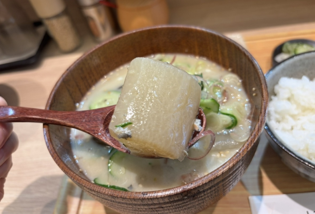 見てください。冷や汁なのに、当店の冷や汁には、こんなゴロゴロ大きな大根が入っているんです。