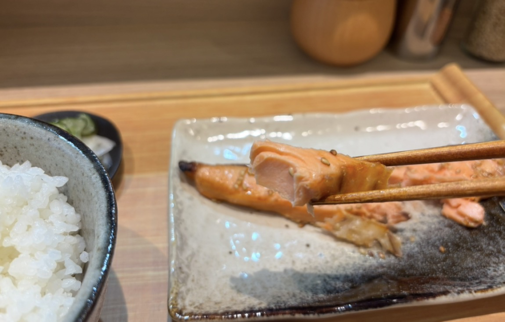 麹漬けの鮭も美味。店内で注文を頂いてから丁寧に焼いています。ごはんによく合う一品です。